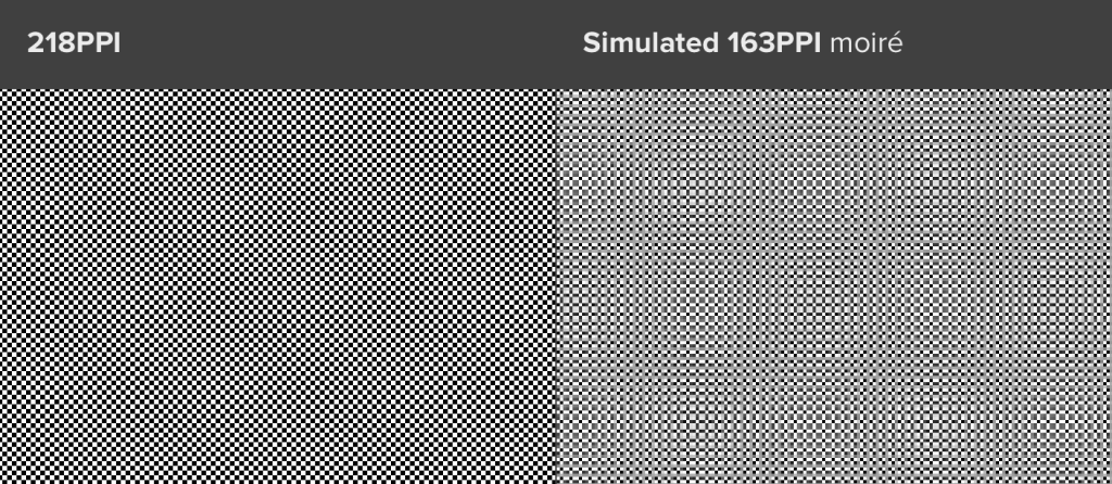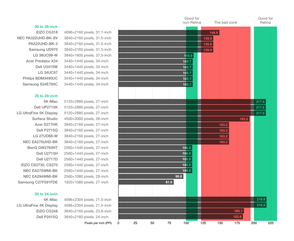 Bir monitörün retina uyumlu olabilmesi için, mutlaka MacOS’un x2 ölçeklendirme standartlarına uygun piksel yoğunluğunu (PPI) sağlaması gerekir. 218 PPI değerinin altında olan monitörler bu retina gereksinimlerini karşılamaz.